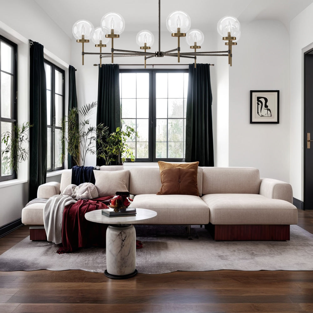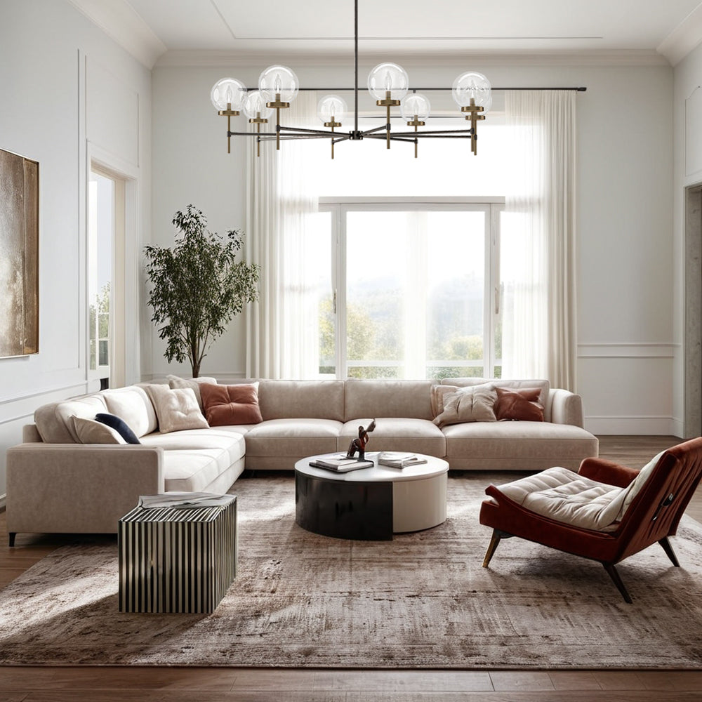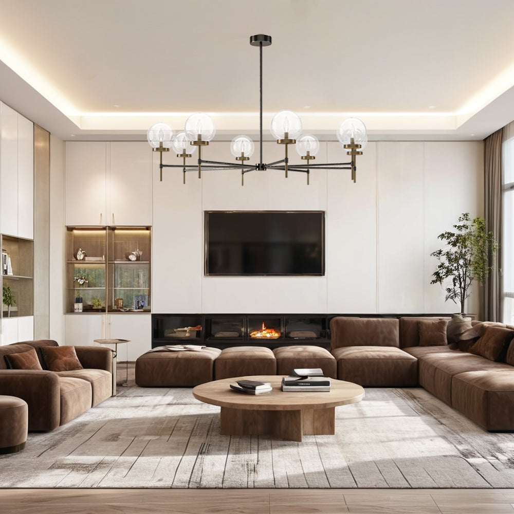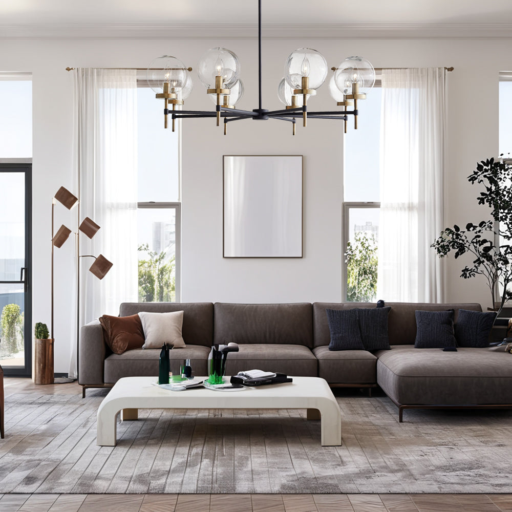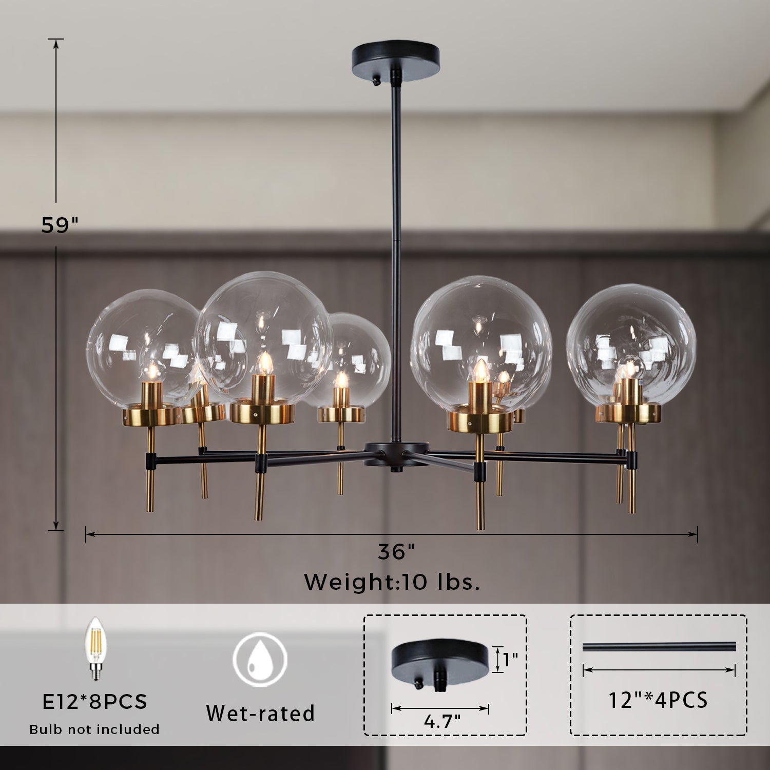 - The glass globe round chandelier features a brilliant display of two-toned metals and blown-glass orbs, creating a modern and sleek aesthetic inspired by mid-century form.