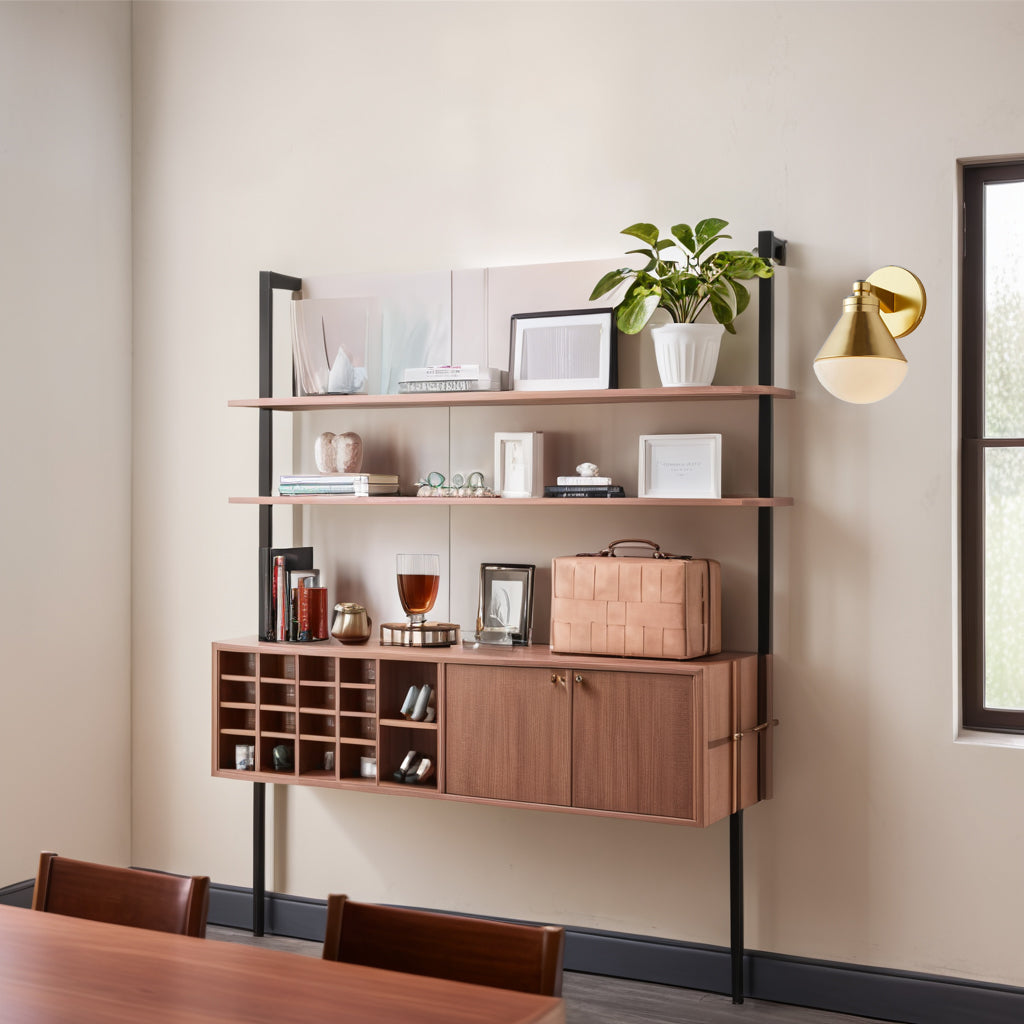 - This sconce is inspired by 1940s French industrial lighting and features a brass fixture with a cased white glass shade, showcasing clean lines and a minimalist aesthetic that plays with geometric forms.